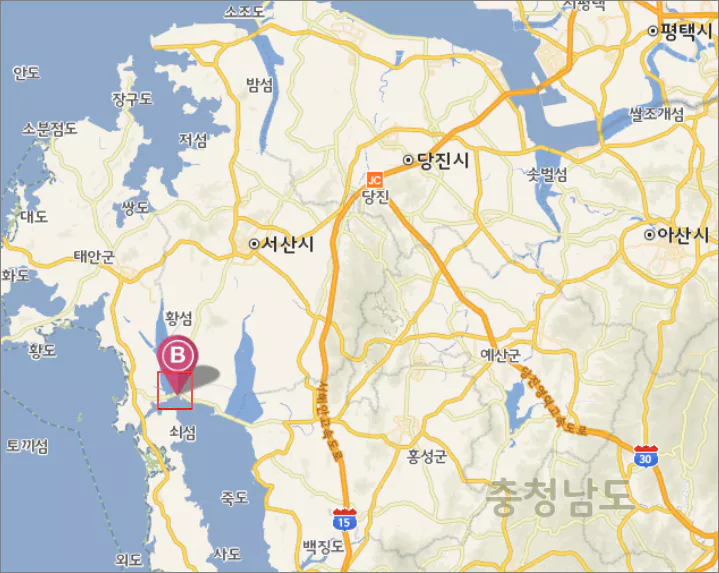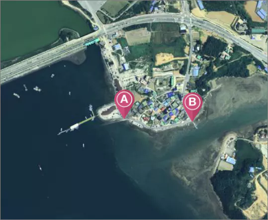 항공사진으로 보면 아래와 같은 위치에 있습니다. 아래의 이미지에서 A 지역이 창리 선착장이고, B 지역은 창촌 나루터, 그리고 좌측 상단의 다리처럼 보이는 모습이 천수만 B지구 방조제의 일부 모습입니다.