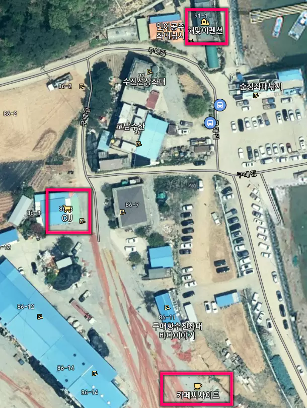 구매항 주변의 항공사진을 보면 대략 아래와 같은 지형으로 둘러 싸여 있습니다.